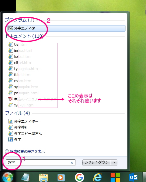 1.『プログラムのフィルと検索』ボックスルに「外字」と入力します