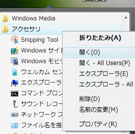 スタートメニューから「すべてのプログラム」をクリックします。次に「アクセサリ」の上で右クリックし、「開く」をクリックします