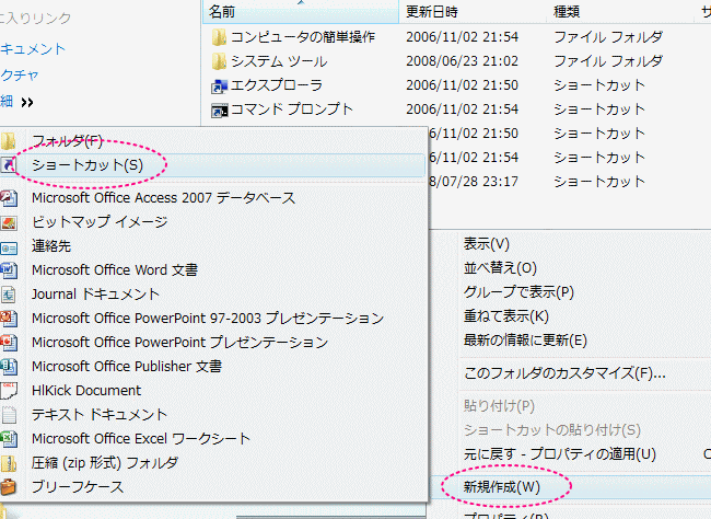 開くをクリックした後、開くフォルダの何もないところ(絶対に何も無いところですよ)で右クリックし、「新規作成」-「ショートカット」の順にクリックします。