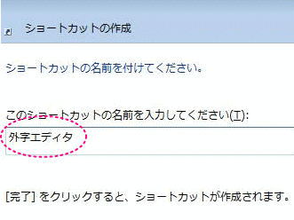 ショートカットの名前に「外字エディタ」と入力し、[完了] をクリックします。